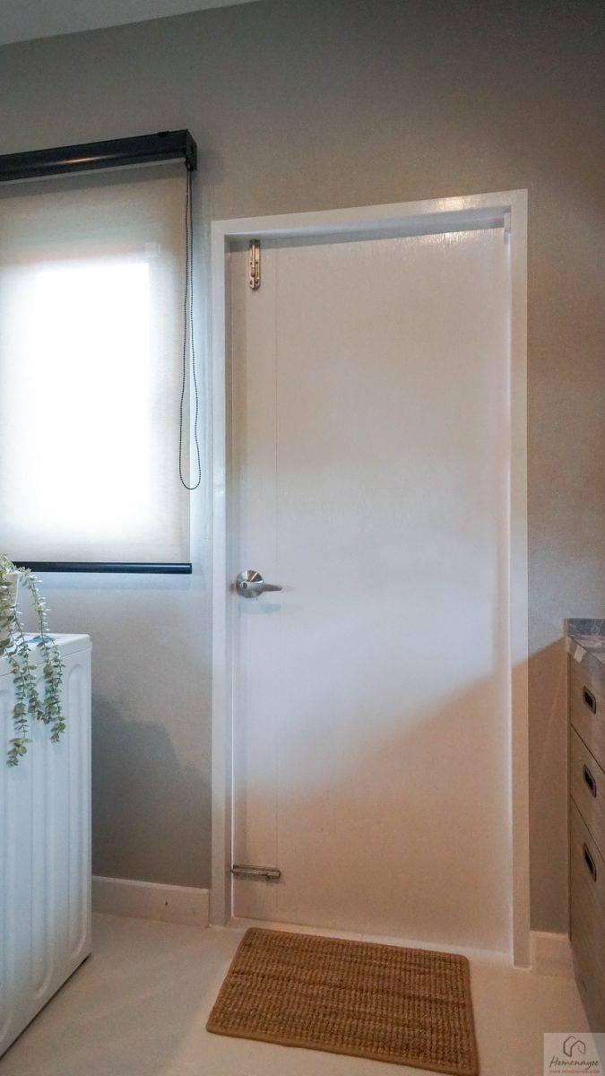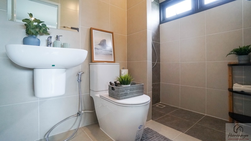 ถัดมาเป็นห้องน้ำชั้นล่าง ด้านหน้าจะมีพื้นที่เหลืออยู่พอประมาณสามารถวางเป็นตู้เก็บของหรือชั้นวางมาเสริมเข้าไปก็ได้ หรือใครจะทำเป็น Pet Zone สำหรับสัตว์เลี้ยงตัวเล็ก ๆ ก็ได้ค่ะ