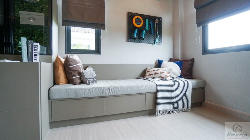 มาดูที่ห้องพักผ่อนชั้นบนก่อนเลย ได้พื้นที่การใช้งานขนาดใหญ่ขึ้น ในอนาคตสามารถปรับเปลี่ยนฟังก์ชันกั้นห้องเพิ่มเติมก็ได้ บ้านตัวอย่างตกแต่งเป็น Family Area มาให้ดูเป็นไอเดีย โดย Built-in เป็นชุดโซฟา L-Shape แบบเข้ามุมมีลิ้นชักเก็บของในตัว ด้านหลังมีหน้าต่างเป็นช่องรับแสงขนาดใหญ่ให้ 1 บาน ทำให้พื้นที่ตรงนี้มีความโปร่งโล่งไม่รู้สึกอึดอัดเลย