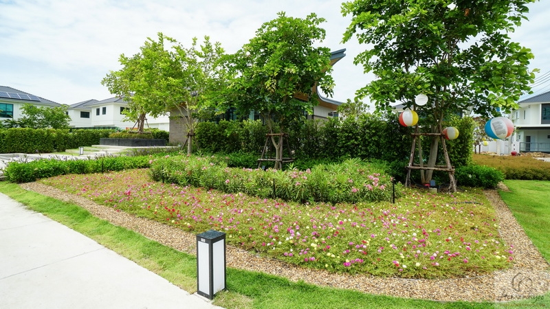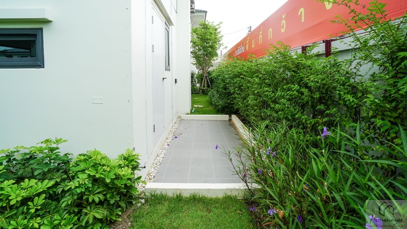 ฝั่งขวาตกแต่งเป็นสวนสวย ๆ สร้างบรรยากาศร่มรื่นตลอดแนวรั้ว ด้านข้างทั้ง 2 ฝั่ง มีฟุตบาทเป็นทางเดินเท้ายาวเข้าไปด้านใน ช่วยเพิ่มความสะดวกและปลอดภัยให้กับลูกบ้านมากยิ่งขึ้น ถัดเข้าไปจะมีประตูสำหรับลูกบ้านที่เดินเท้าเข้า-ออกโครงการให้ด้วย