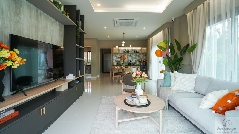 ระยะห่างจากโซฟาและชั้นวางทีวี สามารถนั่งดูทีวีจอใหญ่ได้ในระยะสบายสายตา มีพื้นที่ตรงกลางเหลือให้เดินเข้า-ออกไปยังส่วนอื่น ๆ ได้อย่างสะดวก