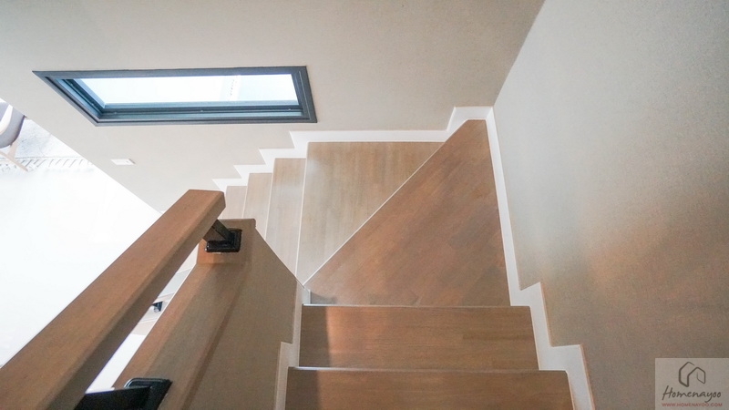 บันไดบ้านโครงสร้างคอนกรีตเสริมเหล็กมีความแน่นแข็งแรงทนทานเช่นเดียวกัน ลูกนอนปิดผิวด้วยไม้ยางพาราประสานสำเร็จรูปสีเทาอ่อน