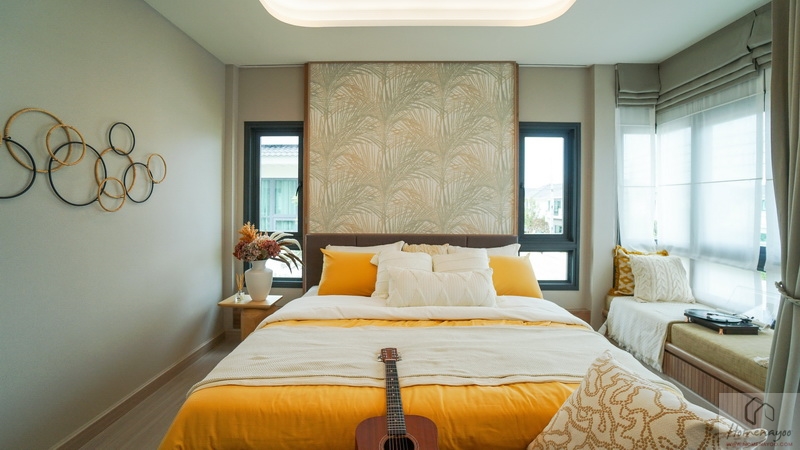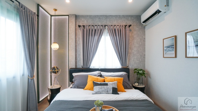 ฝั่งหัวเตียงบ้านตัวอย่างวางโต๊ะข้างเตียง 2 ฝั่งให้ดูระยะการใช้งาน พร้อมตกแต่งด้วยโคมไฟห้อยเพดานสวย ๆ มีช่องรับแสงธรรมชาติขนาดใหญ่ให้ 2 บานเช่นกัน ช่วยให้ห้องดูโปร่งระบายอากาศได้เยอะ