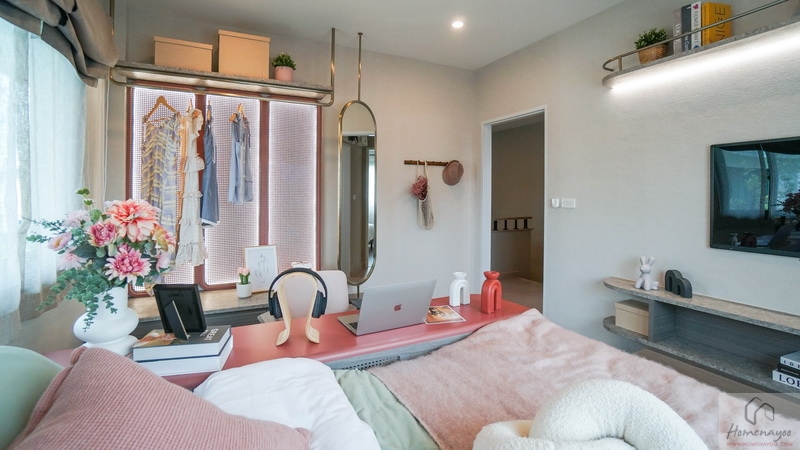 ด้านข้างเตียงนอนทางฝั่งขวาเพิ่มฟังก์ชันการใช้งานด้วยการจัดเป็นมุมโต๊ะทำงานได้อย่างพอดี