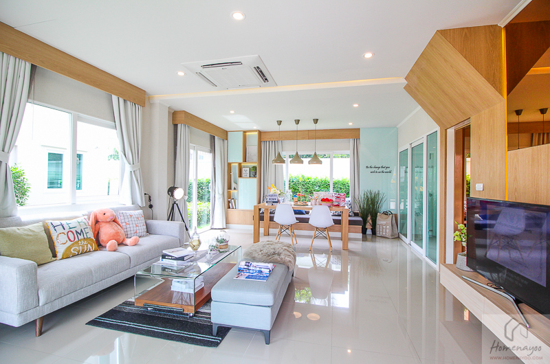 บ้านตัวอย่างทำเป็นห้องนั่งเล่นให้ดู ระยะดูทีวีประมาณ 3.17 ม.