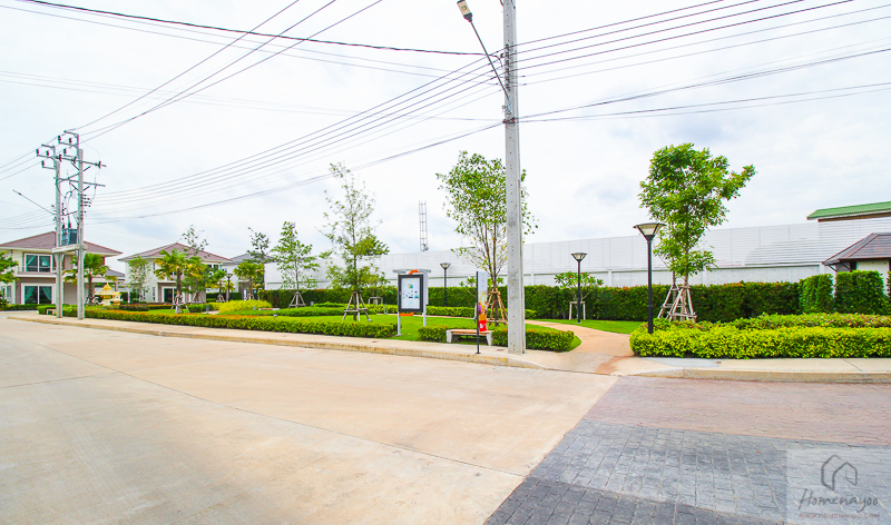สาธารณูปโภค – ส่วนกลางที่นี่จะมีสวนมาให้อยู่ติดกับซุ้มประตูโครงการ ภายในสวนมีทั้งไม้ใหญ่และไม้พุ่มตกแต่งมาได้ร่มรื่นดี มีสนามหญ้าโล่งๆไว้ทำกิจกรรมต่างๆพร้อมพื้นที่นั่งพักผ่อน และสนามเด็กเล่น ถนนหลักโครงการกว้าง 12 ม. ถนนซอยกว้าง 9 ม. ระบบรักษาความปลอดภัยมี รปภ. ตลอด 24 ชม. ร้ัวรอบโครงการสูง 3 ม. บนรั้วต่อระแนงเพิ่มอีก 2 ม. ประตูทางเข้าออกโครงการเป็นประตูเลื่อนอัตโนมัติ ใช้ระบบ Access Control แยกทางเข้าออก ตรงกลางเป็นป้อมยาม ติดตั้ง CCTV ที่ประตูทางเข้าและจุดสำคัญภายในโครงการ เพื่อความปลอดภัยของลูกบ้าน