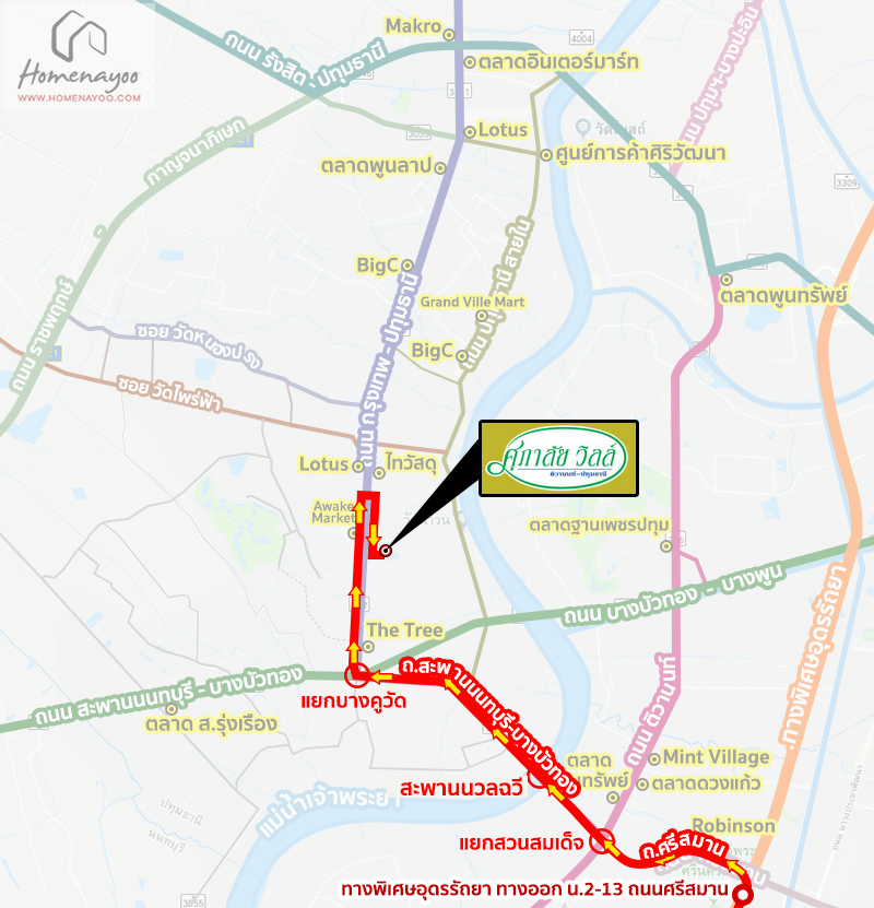 การเดินทางเริ่มจาก ทางพิเศษอุดรรัถยา ทางออก น.2-13 ถนนศรีสมาน (ติวานนท์-ดอนเมือง) ⇒ ถนนศรีสมาน ⇒ แยกสวนสมเด็จฯ ⇒ ถนนสะพานนนทบุรี-บางบัวทอง (345) ⇒ แยกบางคูวัด ขับตรงไปประมาณ 2.2 กิโลเมตร กลับรถ แล้วเลี้ยวเข้าซอยถึงโครงการ ศุภาลัย วิลล์ ติวานนท์-ปทุมธานี *ตรงข้ามตลาด Awake