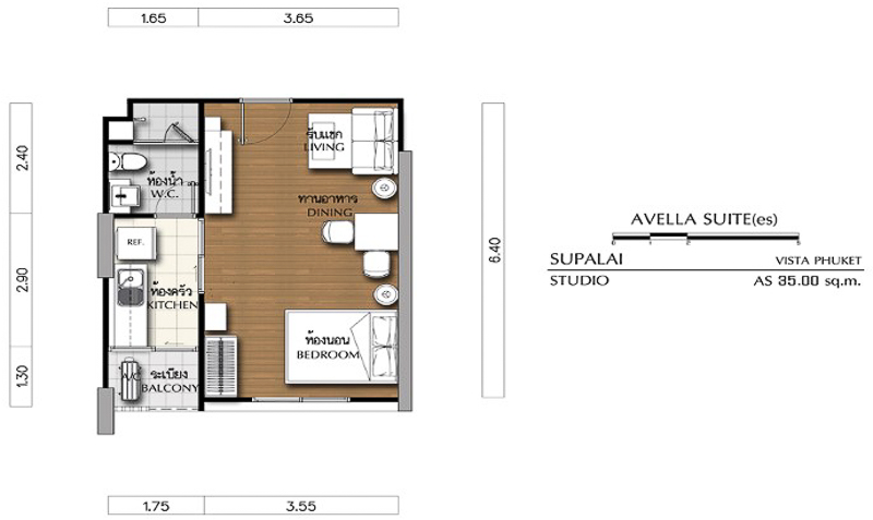 แบบแรกที่จะพามาชมเป็น Studio ขนาด 35.00 ตร.ม. เดินเข้าห้องมาเจอส่วนห้องนั่งเล่นก่อน เชื่อมกับส่วนรับประทานอาหาร และส่วนห้องนอนด้านในสุด ฝั่งซ้ายจะเป็นห้องครัว ได้เป็นครัวปิด มีทางเดินออกไปตรงระเบียง ส่วนห้องน้ำอยู่ในห้องครัว