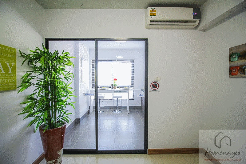 ถัดมาจะมีพื้นที่ให้วางโต๊ะทำงาน หรือตู้เก็บของได้ ด้านในเป็นห้องครัว แอร์ติดผนัง 1 ตัว