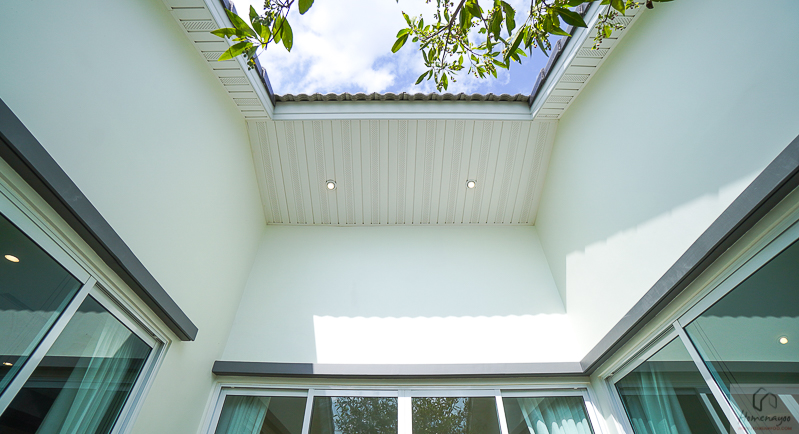 เงยหน้ามองบนหลังคาส่วนนี้จะเว้นเปิดโล่ง ถ้าปลูกต้นไม้สูง ๆ ส่วนยอดก็สามารถสูงขึ้นไปได้อีก