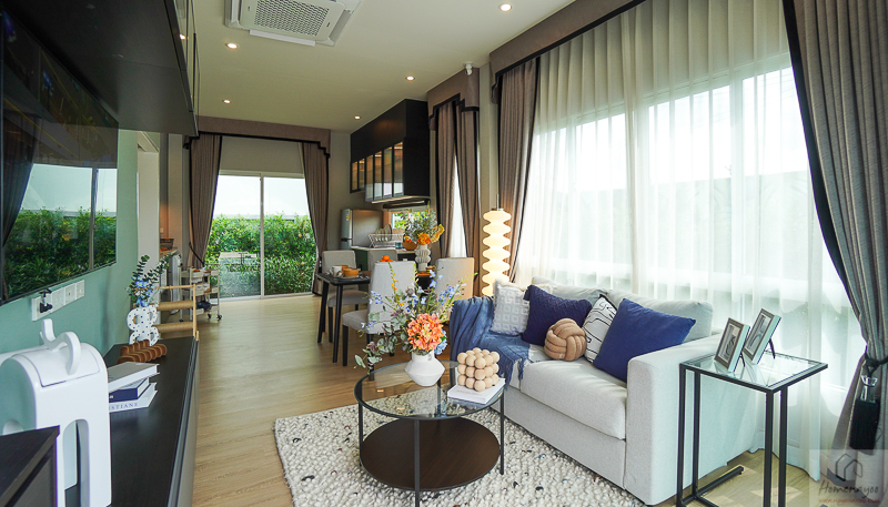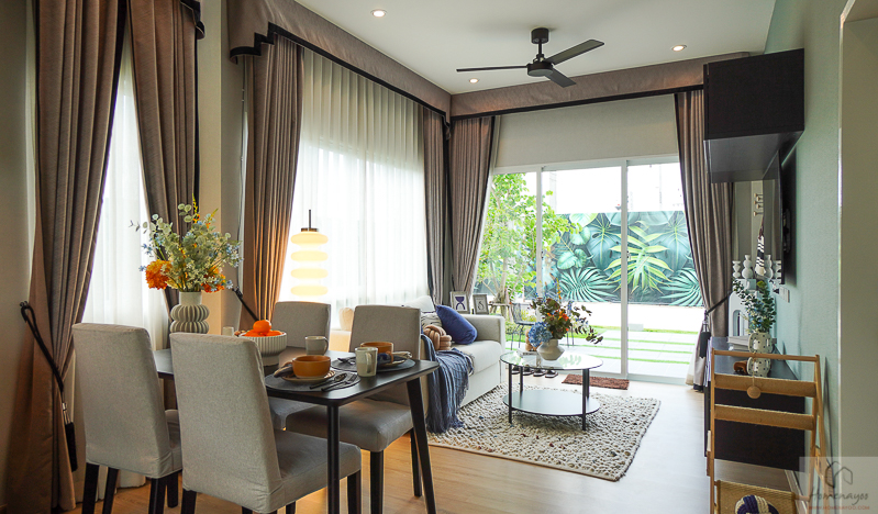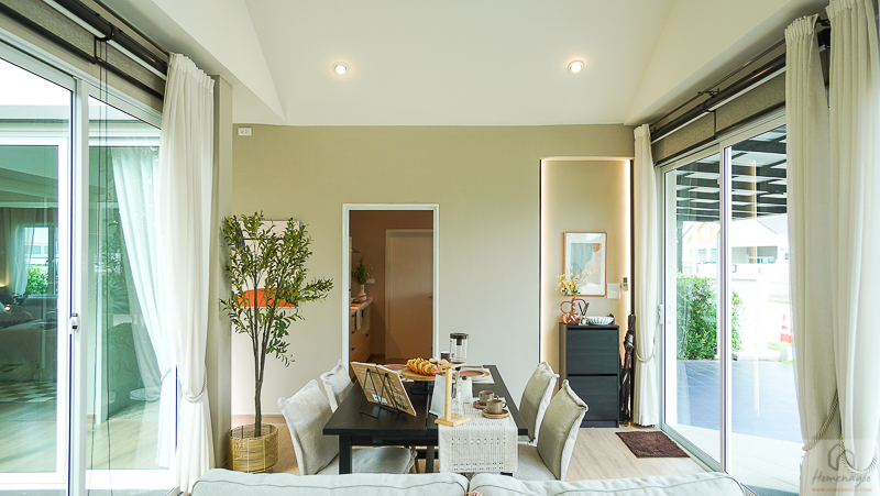 เข้าบ้านมาจะเห็นได้ถึงความโปร่ง โล่ง โดยส่วนแรกจะเป็น Common Area ใช้งานร่วมกันระหว่างส่วนห้องนั่งเล่นและส่วนรับประทานอาหาร ขวามือเป็นห้องครัว ถัดไปด้านในเป็นห้องนอน 2 ห้อง