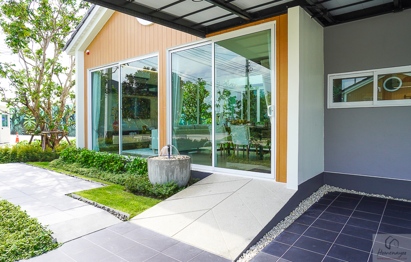 ประตูบ้านเป็นกระจกบานเลื่อน ทางเข้าออกบ้านออกแบบให้เป็น Ramp หรือทางลาด เพื่อความสะดวกและรองรับการใช้งานวีลแชร์