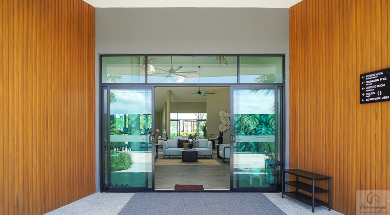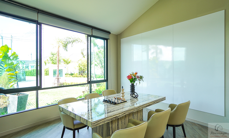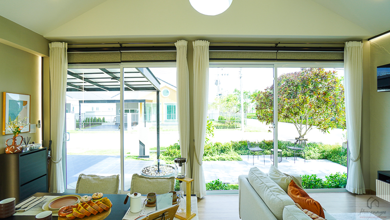 เดินเข้ามาแล้วมองกลับไปที่ประตูหน้าบ้าน จะเห็นว่ามีประตูกระจกบานเลื่อน 2 ส่วนขนาดใหญ่ ช่วยเพิ่มความโปร่งให้กับบ้านได้ดี