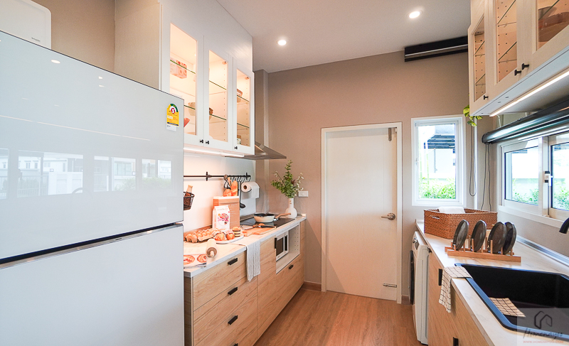 ภายในห้องครัวได้เป็นครัวปิดแยกเป็นสัดส่วน ให้พื้นที่มาพอสมควรสามารถทำเคาน์เตอร์ครัวได้ 2 ฝั่ง แบ่งฟังก์ชันได้ตามต้องการ บ้านมาตรฐานจะได้เป็นห้องโล่งๆ เดินระบบน้ำไว้รองรับ