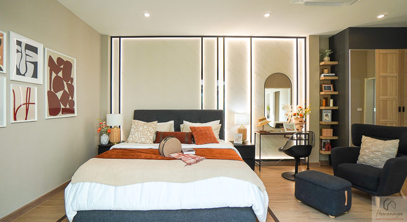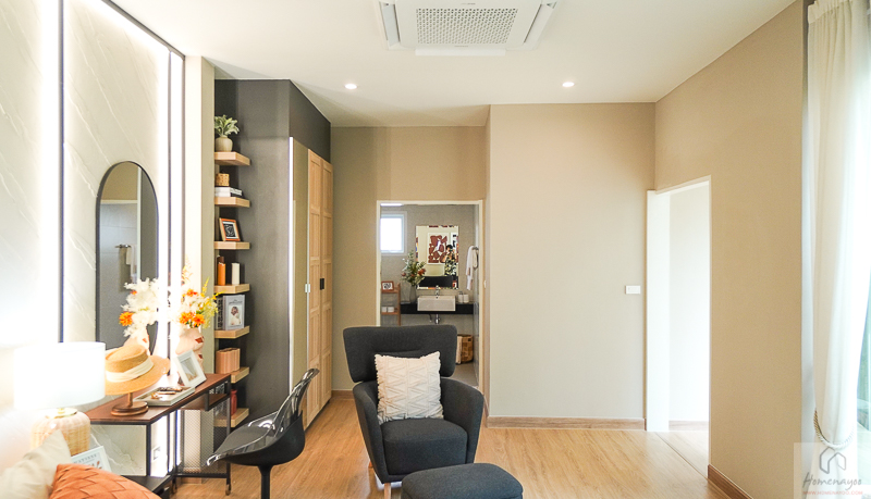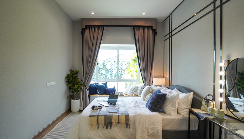 Master Bedroom พื้นที่ขนาดใหญ่วางเตียง King Size, โต๊ะข้างเตียง, ตู้เสื้อผ้า, โต๊ะเครื่องแป้ง พร้อมหน้าต่างแบบ Bay Window ที่เป็นมุมนั่งเล่นรับวิวหน้าบ้าน และมีห้องน้ำในห้องนอนที่ออกแบบมาเพื่อรองรับผู้สูงอายุโดยเฉพาะ