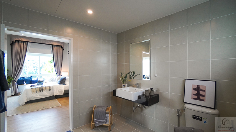 ภายในห้องน้ำแบ่งส่วนเปียกส่วนแห้ง ตกแต่งพื้นและผนังด้วยกระเบื้องเซรามิกลายหิน ระดับพื้นห้องน้ำจะเรียบเสมอกันกับพื้นบ้าน ไม่ต้องกลัวสะดุดพื้น
