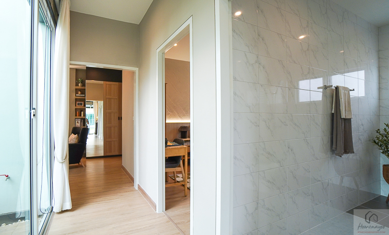 ถัดไปจะมีทางเดินเชื่อมไปยังส่วนอื่น ๆ ในบ้าน ซ้ายมือเป็นประตูเชื่อมออกคอร์ทกลางบ้าน ขวามือเป็นห้องน้ำและห้องนอน 2 ตรงหน้าเป็นห้อง Master Bedroom
