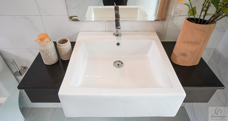 ได้อ่างล้างมือทรงสี่เหลี่ยมของ Mogen ฝังเคาน์เตอร์มาให้ มีพื้นที่วางของได้เยอะดี