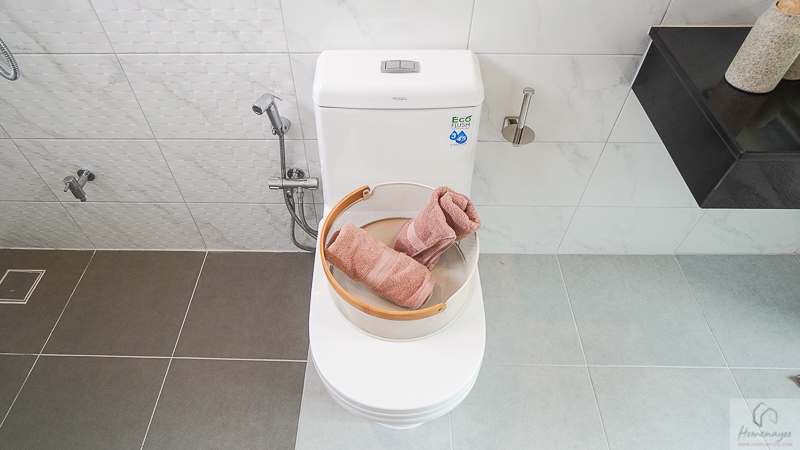 ติดกันวางโถสุขภัณฑ์ของ Mogen พร้อมติดตั้งสายฉีดชำระ และที่ใส่กระดาษทิชชู่มาให้เรียบร้อย