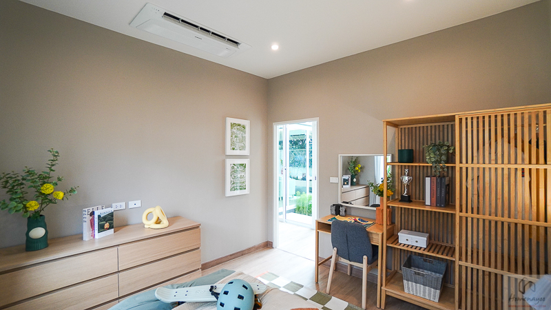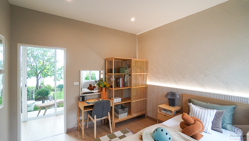 ห้องครัวได้เป็นครัวปิดพื้นที่กำลังดี หรือจะต่อเติมข้างบ้านอีกก็ได้ ห้อง Master Bedroom ขนาดใหญ่ แบ่งพื้นที่วางเตียง King Size, โต๊ะข้างเตียง, อาร์มแชร์, ตู้เสื้อผ้า, โต๊ะเครื่องแป้ง พร้อมห้องน้ำในตัว ห้องนอน 2 พื้นที่วางเตียง 3-5 ฟุตได้ และยังโต๊ะกับตู้ได้ครบ