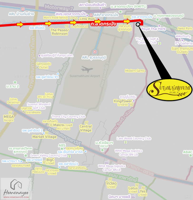 การเดินทางเริ่มจาก ถ.ลาดกระบัง – ถ.หลวงแพ่ง แยกกิ่งแก้วแยกลาดกระบัง กลับรถใต้สะพานข้ามคลองจระเข้ ถึงโครงการสุวรรณภูมิทาวน์ @หัวตะเข้ *ใกล้ซ.ลาดกระบัง 54/4