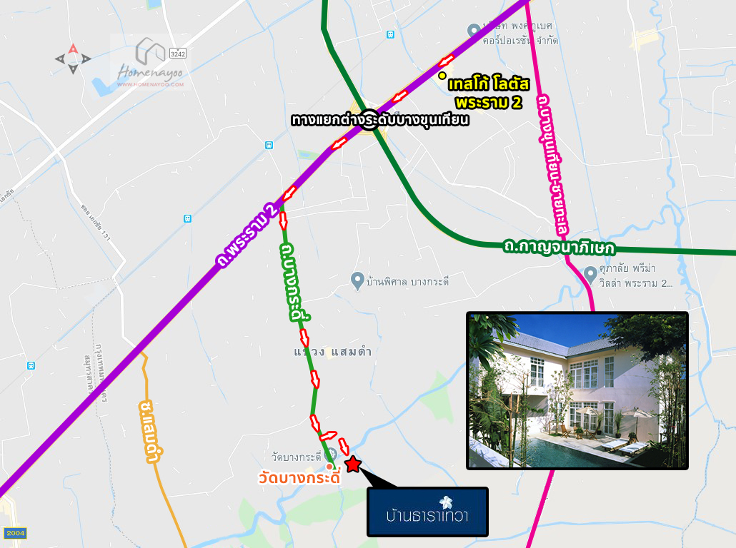 จากนั้นวิ่งตรงตาม ซอยบางกระดี่ 43 ระยะทางอีก 200 เมตร เลี้ยวขวาเข้าโครงการ บ้านเดี่ยว บ้านธาราเทวา พระราม 2 ถึงแล้วครับ
