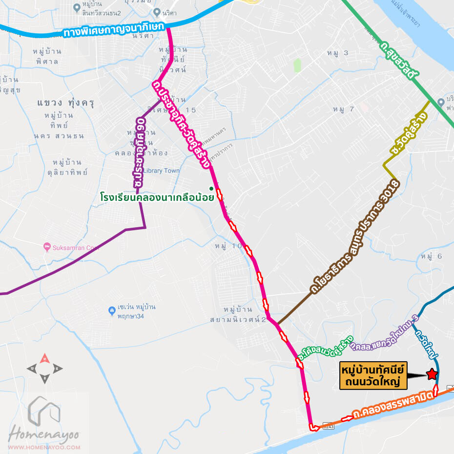 การเดินทาง ผมเริ่มจาก ถนนประชาอุทิศ – วัดคู่สร้าง มุ่งหน้าไปทางใต้ (หน้า โรงเรียนคลองนาเกลือน้อย) ⇒ เลี้ยวซ้ายเข้าสู่ ถนนคลองสรรพสามิต ⇒ เลี้ยวซ้ายเข้าสู่ ถนนวัดแหลม-วัดใหญ่ ⇒ หมู่บ้าน ทัศนีย์ ถนนวัดใหญ่ *โครงการอยู่ใกล้ วัดเอี่ยมประชามิตร