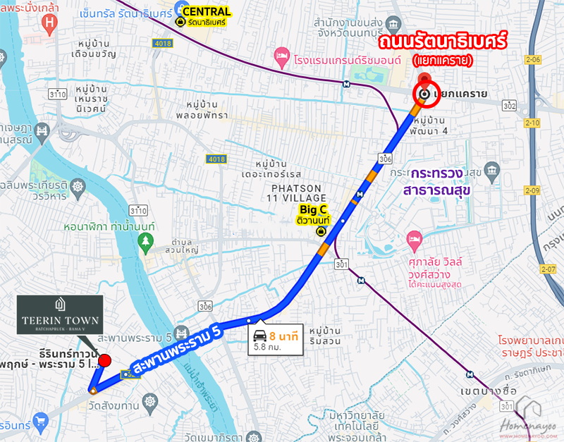 การเดินทางวันนี้ เราเริ่มจากถนนกาญจนาภิเษก ⇒ ขึ้นทางแยกต่างระดับบางคูเวียง ⇒ ไปลงถนนนครอินทร์ ขับตรงมาประมาณ 8 กม.* จะเจอกับถนนบางไผ่พัฒนา ติด Makro นครอินทร์ ⇒ จากนั้นขับตรงเข้าไปอีกประมาณ 400 ม.* ⇒ ถึงโครงการ ธีรินทร์ทาวน์ ราชพฤกษ์-พระราม 5 (โครงการอยู่ทางฝั่งซ้ายมือ)