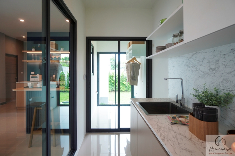 พื้นที่ภายในห้องครัวมีขนาดกำลังดีเรา Built-in เคาน์เตอร์ครัวได้ทั้ง 2 ฝั่งเลย ฝั่งหลังบ้านจะมีประตูเปิดออกไปที่ลานซักล้างได้