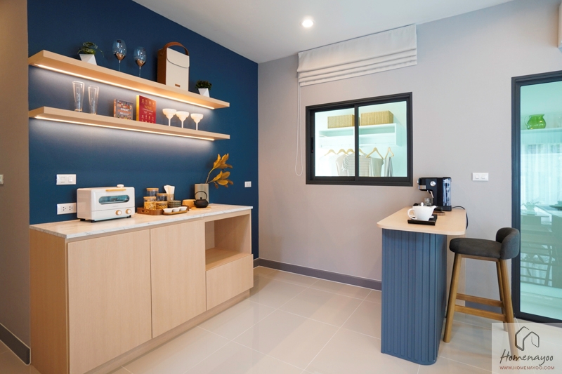 ด้านข้างมีพื้นที่สำหรับการทำห้องครัวด้วย ขนาดของเคาน์เตอร์ครัวและ Island ที่ทำได้ใช้เตรียมอาหารแบบจริงจังได้เลยค่ะ ส่วนบ้านตัวอย่างตกแต่งมาเป็น Coffee Bar และแพนทรี่สำหรับเตรียมอาหารเช้า