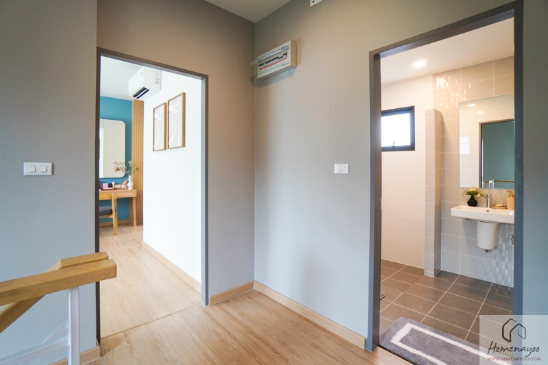 สำหรับห้องน้ำชั้นบนเป็นห้องที่แชร์กันระหว่างห้องนอนรองและห้องนอนเล็ก มีการแบ่งโซนเปียก-โซนแห้งออกจากกันอย่างเป็นสัดส่วน ตกแต่งด้วยโทนสีขาว-เทา และใช้สุขภัณฑ์รุ่นมาตรฐานของบ้านเหมือนห้องน้ำชั้นล่างค่ะ
