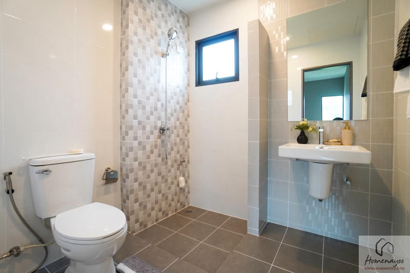 ภาพบรรยากาศภายในห้องน้ำ ตกแต่งด้วยกระเบื้องและสุขภัณฑ์รุ่นมาตรฐานของบ้าน