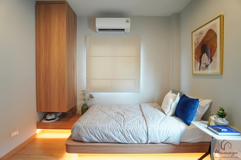 ใครที่ชอบดูทีวีตอนก่อนนอน สามารถเพิ่มชั้นวางทีวีและสตูลปลายเตียงได้ แต่ถ้าไม่ชอบให้มีพวกคลื่นไฟฟ้ารบกวนการนอน ก็สามารถ Built-in เป็นชั้นวางของ จัดเป็นโต๊ะนั่งเขียนหนังสือ หรือเป็นมุมวางม้านั่งพักผ่อนสบาย ๆ อีกสักตัวก็ทำได้ค่ะ
