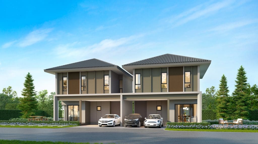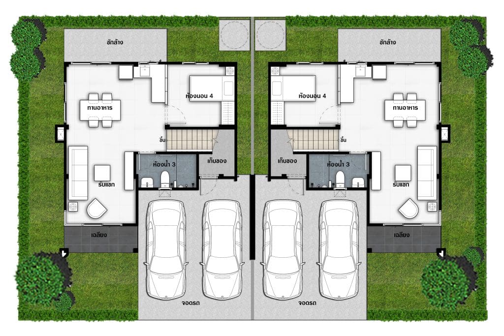 แบบบ้าน Kannika B บ้านแฝด 2 ชั้น พื้นที่ใช้สอย 157.5 ตร.ม. ฟังก์ชัน 4 ห้องนอน, 3 ห้องน้ำ และ 2 ที่จอดรถ