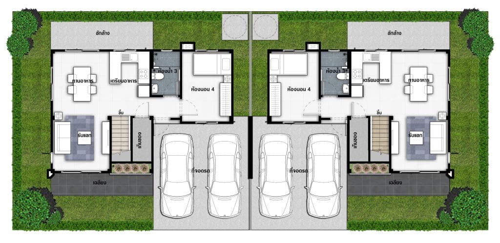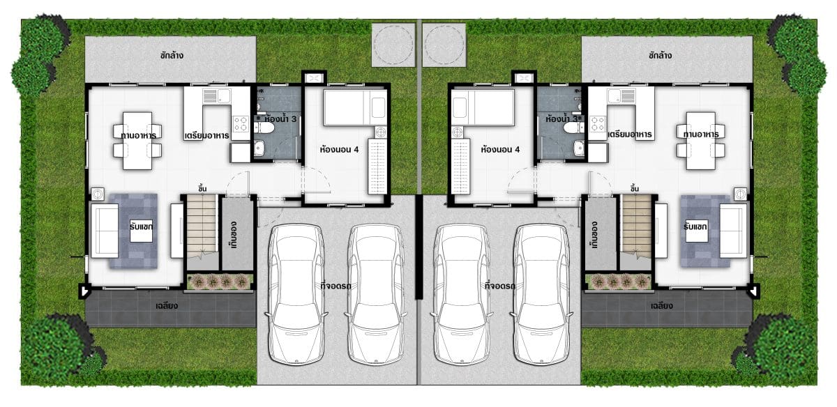 พื้นที่โรงจอดรถสามารถจอดได้ 2 คัน ลงเสาเข็มให้แบบปูพรมแยกโครงสร้างจากตัวบ้าน ทำผิวคอนกรีตขัดเรียบ ข้อดีของบ้านแฝดที่นี่ก็คือ มีการดีไซน์ให้ผนังของบ้านไม่ติดกัน จะยังมีพื้นที่เหลือรอบ ๆ บ้าน ส่วนโครงสร้างที่เชื่อมกันจะเป็นคานของโรงจอดรถ ทำให้ได้ความเป็นส่วนตัวเหมือนบ้านเดี่ยวค่ะ