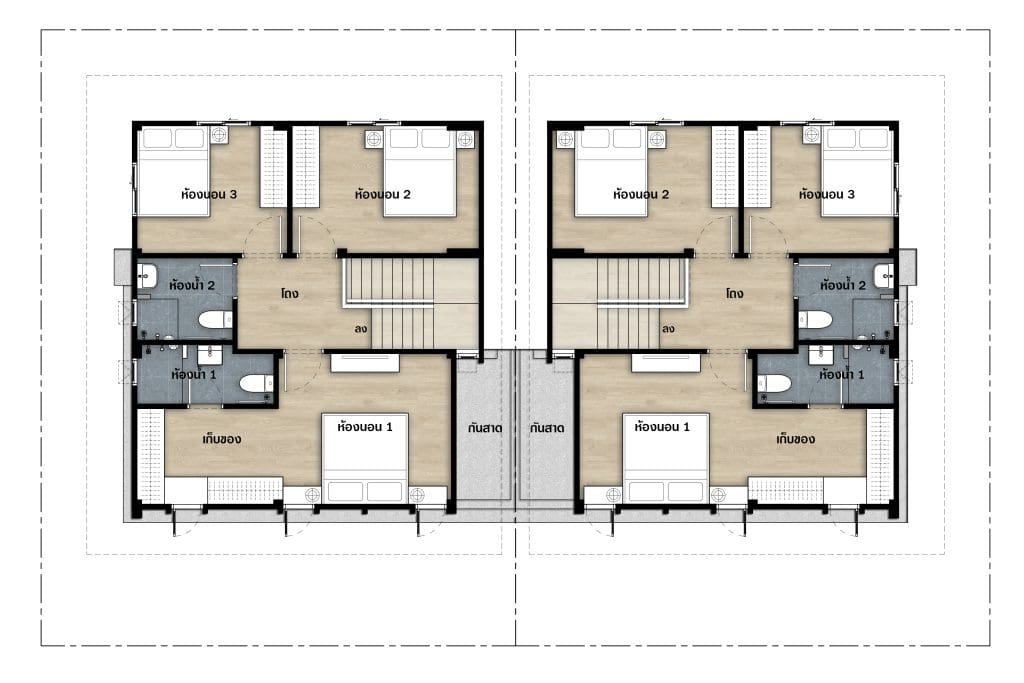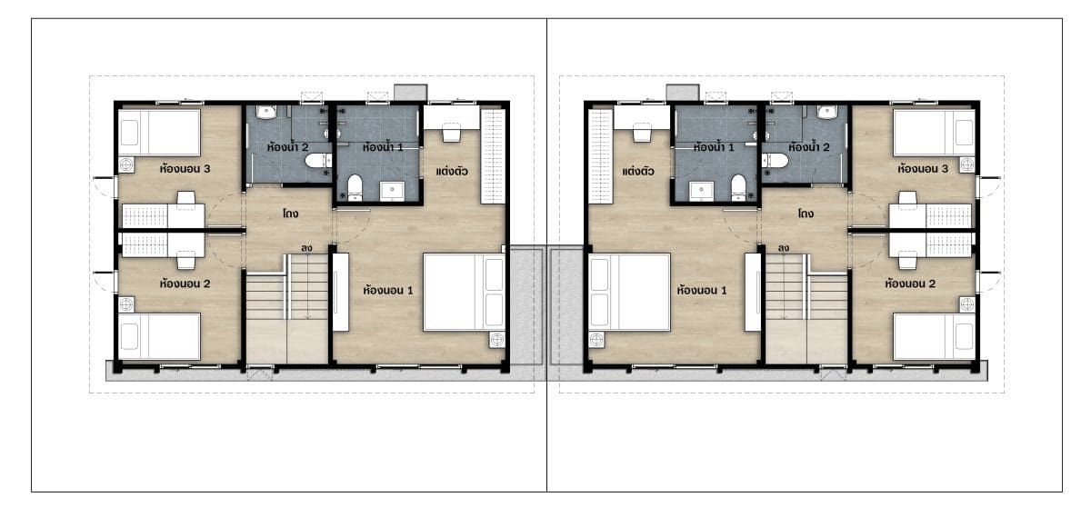 พื้นที่บนชั้น 2 ทั้งหมดปูพื้นด้วย SPC ลายไม้ ฟังก์ชันของชั้นนี้มีห้องนอนทั้งหมด 3 ห้องพร้อมห้องน้ำในตัวทุกห้องเลย