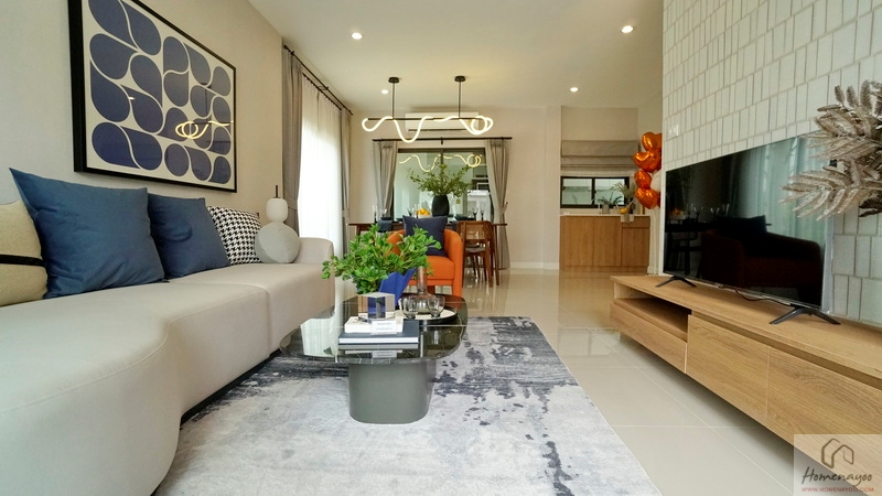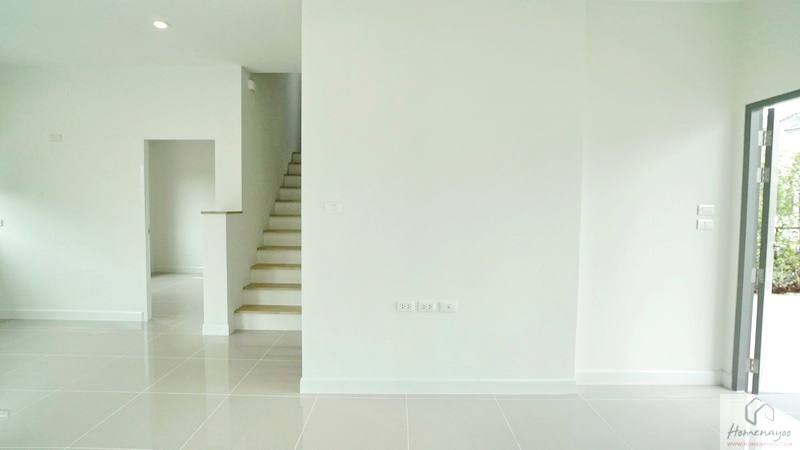 เข้ามาภายในบ้านจะเป็น Living Area แบบ Open Plan ส่วนแรกจะเป็นห้องนั่งเล่น ถัดไปเป็นมุมทานอาหาร และพื้นที่สำหรับต่อเติม Pantry ครัวเล็ก ๆ ในบ้าน วัสดุมาตรฐานที่ได้รับจะเป็นพื้นแกรนิตโต้สีเบจ 60 x 60 ซม. ผนังและฝ้าเพดานฉาบเรียบทาสีขาว พร้อมบัวผนัง และโคมไฟ LED Panel ทั้งหลัง ส่วนความสูงพื้น-ฝ้าเพดานอยู่ที่ 2.7 ม.