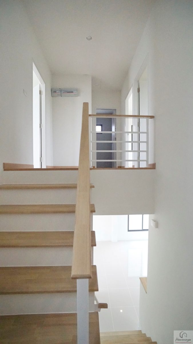 ผ่านชานพักตรงกลางขึ้นไป จะเปลี่ยนมาเป็นราวบันไดระแนงเหล็กสีขาว มือจับไม้ยางพาราประสานสีอ่อน ติดยางต่อเนื่องไปจนถึงโถงบ้านชั้น 2