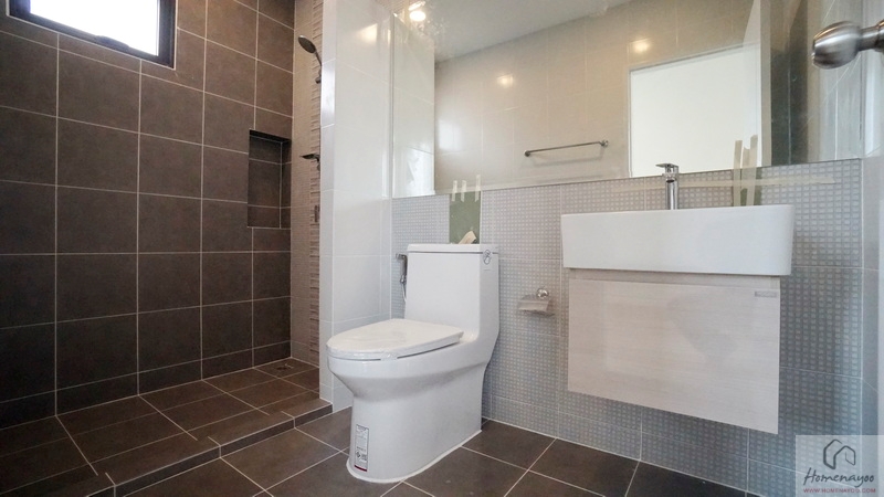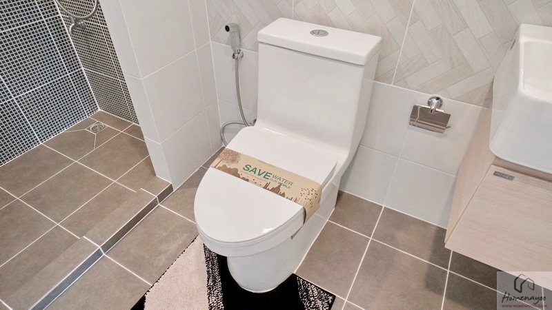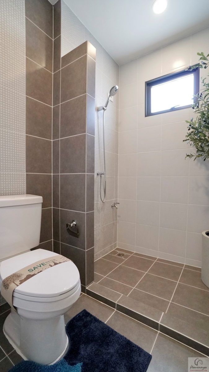 ส่วนฝักบัวได้เป็นแบบ Hand Shower ก๊อกน้ำเป็นโครเมียมก้านโยก พร้อมก๊อกสนามด้านล่าง 1 จุด ผนังเจาะช่องทำชั้นวางของมาให้ 1 ชั้น และมีการเดินงานระบบไฟฟ้าติด Junction Box รองรับการติดตั้งเครื่องทำน้ำอุ่นได้เลย