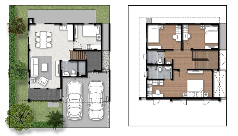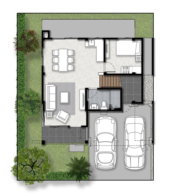 แปลนบ้านชั้น 1 : หน้าบ้านจะรองรับการจอดรถยนต์ได้ 2 คัน ติดกันจะเป็นสวนหย่อมหน้าบ้าน ที่เชื่อมต่อกับสวนหย่อมข้างบ้าน ไปจนสุดลานซักล้างหลังบ้าน เข้ามาภายในบ้านจะเจอกับ Living Area แบบ Open Plan รวมห้องนั่งเล่น, มุมทานอาหาร และ Pantry ไว้ด้วยกัน ขวามือจะเป็นที่ตั้งของห้องน้ำชั้นล่าง ตรงกลางเป็นโถงบัน และด้านหลังสุดจะเป็นที่ตั้งของห้องนอน 4