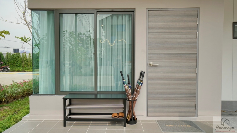 หน้าบ้านจะมีชายคายื่นออกมาให้แบบนี้ พื้นชานพักปูกระเบื้องเซรามิกสีเทา 30 x 30 ซม. พร้อมยกพื้นขึ้นมาจากสนามหญ้า 1 Step ใต้ชายคาติดโคมไฟ LED Panel ให้ 1 ดวง ส่วนประตูทางเข้าเป็นลายไม้บานทึบ มือจับก้านโยก กลอน Double Lock พร้อมบานฟิกซ์เข้ามุม ที่ช่วยทำให้บ้านดูโปร่งและกว้างขึ้น ซึ่งเป็นการออกแบบที่เป็น Highlight ของแบบบ้านที่นี่เลย