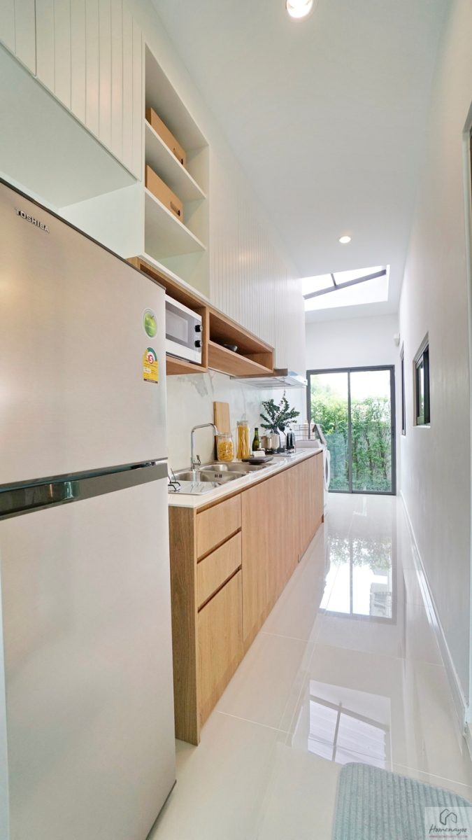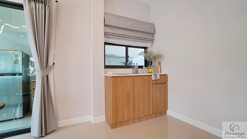 ถัดเข้ามาจะเป็นส่วนของมุมทานอาหาร ขวามือตรงหน้าต่างบานเล็ก จะเป็นจุดสำหรับต่อเติม Pantry หรือ Sink ล้างจาน โดยทางโครงการจะมีการเดินงานระบบประปามาให้เรียบร้อยค่ะ