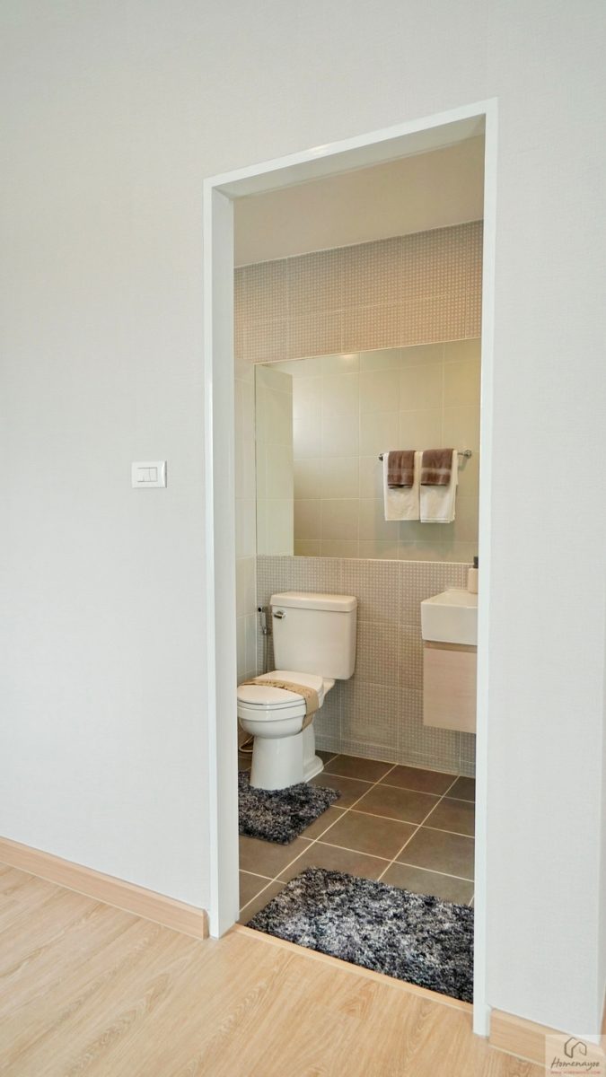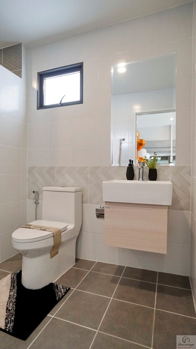 เข้ามาด้านในจะเป็นห้องหน้ากว้าง แบ่งฟังก์ชันการใช้งานไว้ 2 ฝั่ง ส่วนแรกจะเป็นโถสุขภัณฑ์ ถัดเข้าไปด้านในสุดจะเป็นส่วนอาบน้ำ โดยห้องนี้จะตกแต่งกระเบื้องพื้น-ผนังคุมโทนสีเทา มีตัวช่วยระบายอากาศเป็นหน้าต่างกระฝ้าแบบบานกระทุ้งติดมาให้ 1 บาน