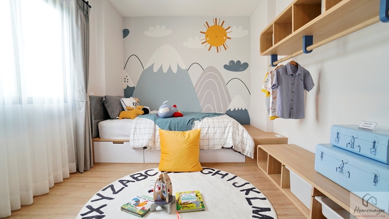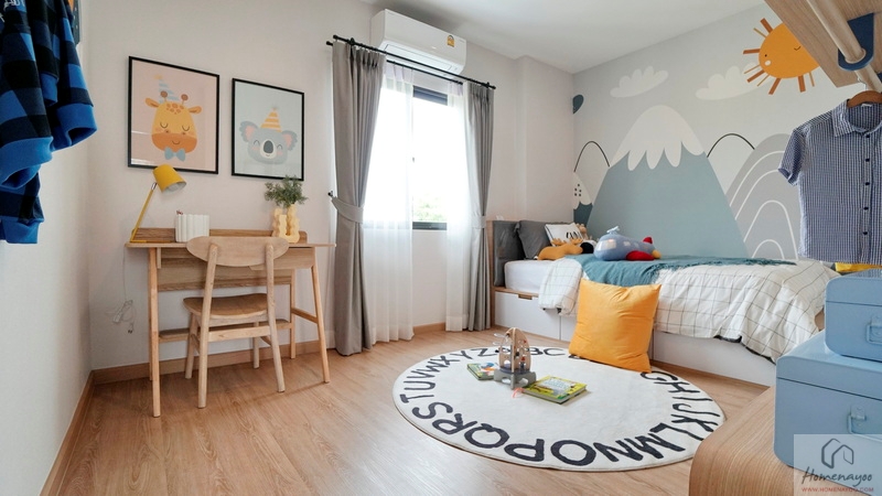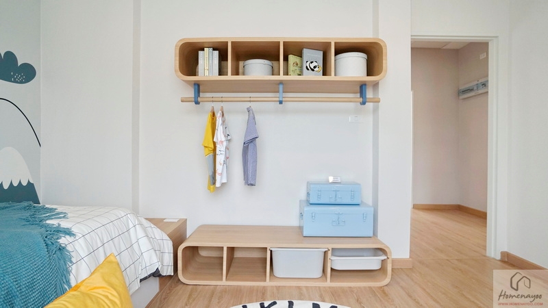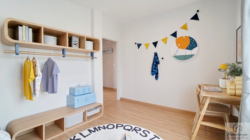 เริ่มจากห้องนอน 2 ทางฝั่งขวามือ ได้พื้นที่มากว้างพอสมควร ในบ้านตัวอย่างตกแต่งเป็นห้องนอนเด็กมาให้ดูในโทนสี Pastel น่ารัก ๆ มาให้ดูเป็นไอเดียค่ะ