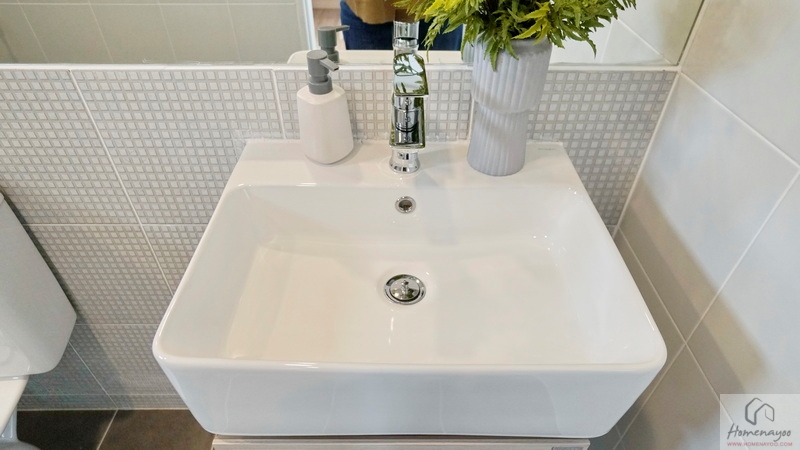 อ่างล้างหน้าทรงเหลี่ยมขอบมน หน้าอ่างมีพื้นที่เหลือให้วางของใช้ในห้องน้ำอีกนิดหน่อย ส่วนก๊อกน้ำได้เป็นโครเมียมก้านโยกทรงสูง เปิด-ปิดใช้งานได้สะดวก ผนังด้านหลังติดกระจกเงาให้ 1 บาน