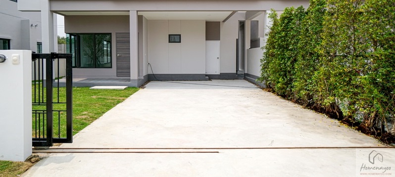 หน้าบ้านได้ที่จอดรถยนต์ 2 คัน พร้อมจุดรองรับ EV Charger, ห้องเก็บของ มีสวนหย่อมหน้าบ้านและข้างบ้านให้เหมือนกันค่ะ