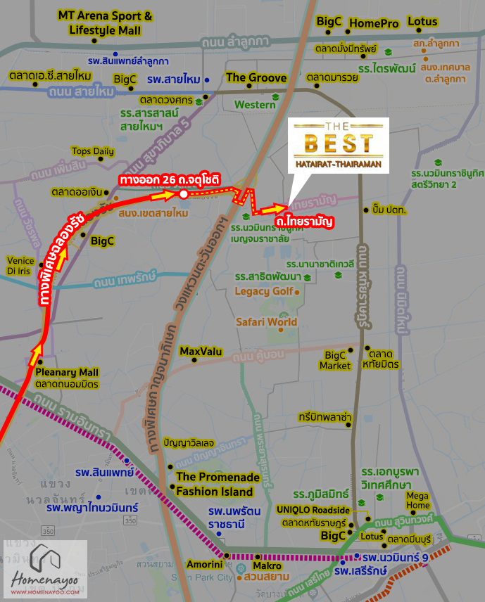 การเดินทางเริ่มจาก ทางพิเศษฉลองรัช (ทางด่วนรามอินทรา-อาจณรงค์)  ลงทางออก 26 ถ.จตุโชติ  ถ.คู่ขนานกาญจนาภิเษก  กลับรถใต้ทางด่วนฯ  ถ.ไทยรามัญ ขับตรงไป 1.8 กม.ถึงโครงการ The Best หทัยราษฎร์-ไทยรามัญ *ใกล้ทางด่วนฯ จตุโชติ