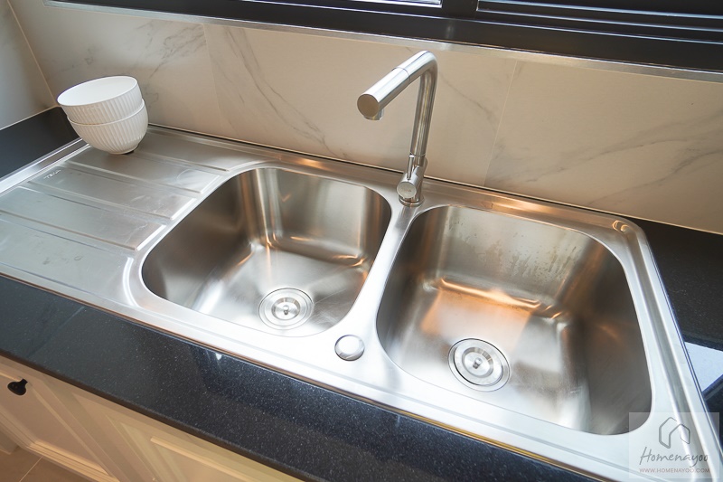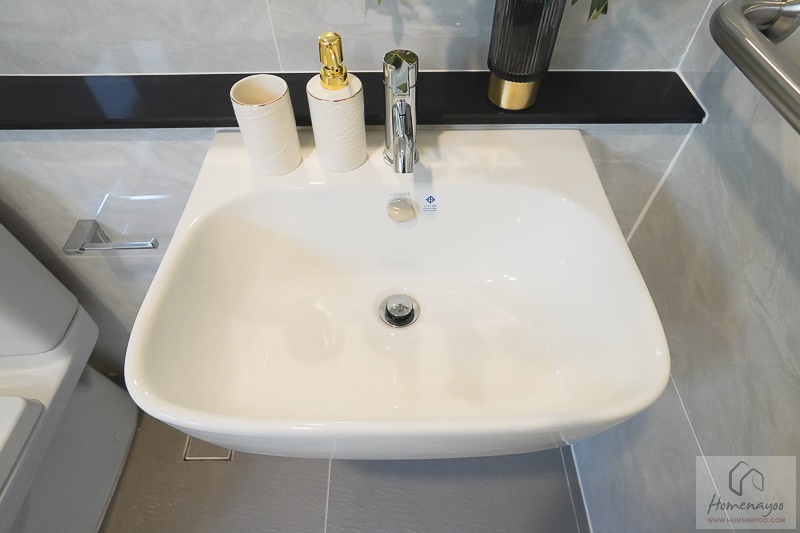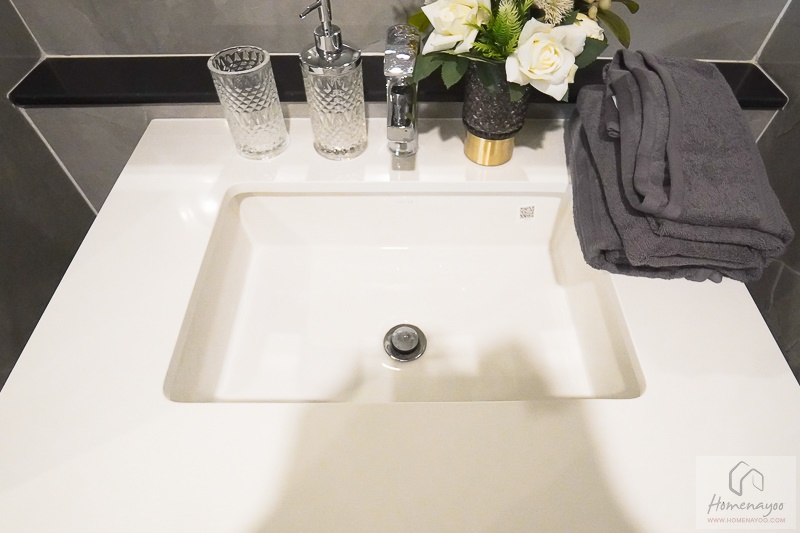 ภายในมีอ่างล้างมือแบบ His & Her ใช้งานได้พร้อมกัน 2 คน เป็นอ่างล้างมือฝังบนเคาน์เตอร์ มีตู้เก็บของให้ด้านล่าง
