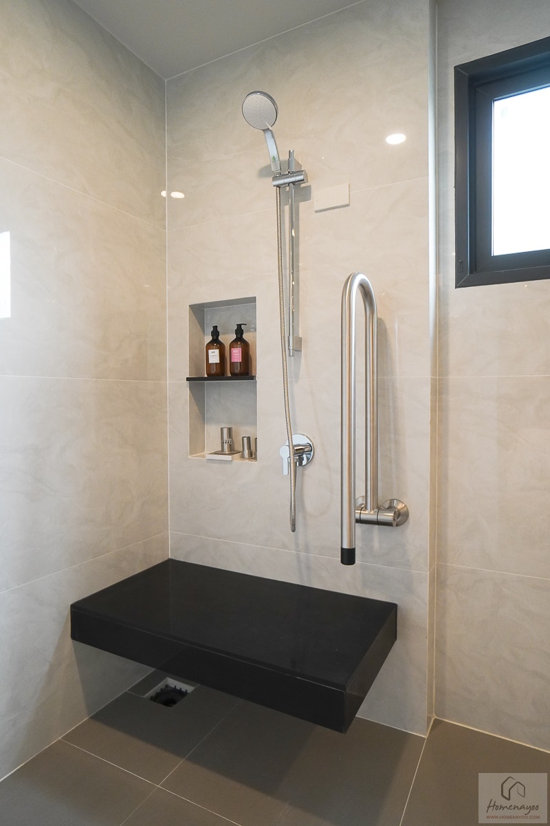 ในส่วนของโซนอาบน้ำจะมีม้านั่งอาบน้ำติดตั้งมาให้ พร้อม Hand Shower, ราวปรับระดับ และชั้นสำหรับวางสบู่