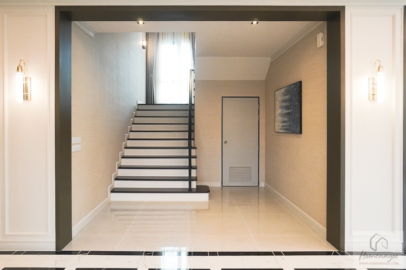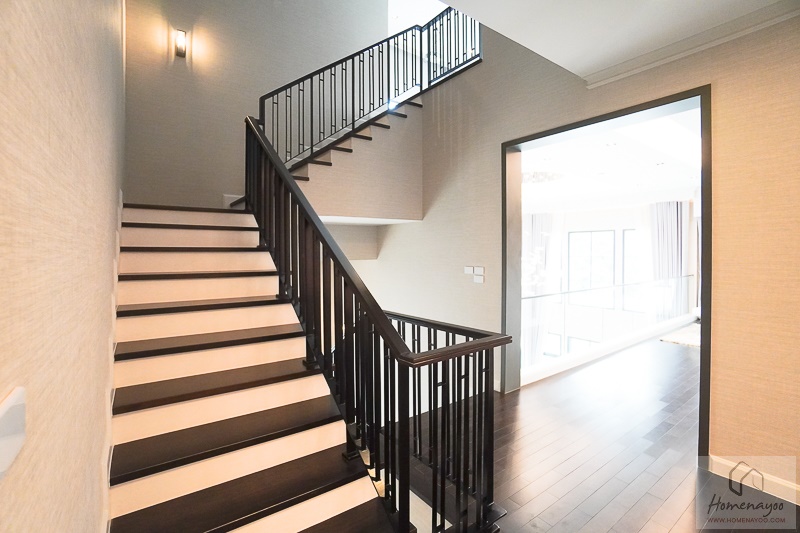 ตั้งแต่พื้นบันไดขึ้นไปจนไปถึงพื้นบ้านบนชั้น 2 จะปูด้วยไม้สักสีเข้มแบบนี้ทั้งหมดเลยนะคะ มือจับบันไดก็ใช้ไม้สักเช่นกัน โดยทางโครงการจะออกแบบ Flight ของบันไดให้มีความกว้างขวางเป็นพิเศษ ทำให้เดินขึ้น-ลงได้สะดวก และยังไม่ต้องกังวลเวลาที่ต้องการย้ายเฟอร์นิเจอร์อีกด้วย