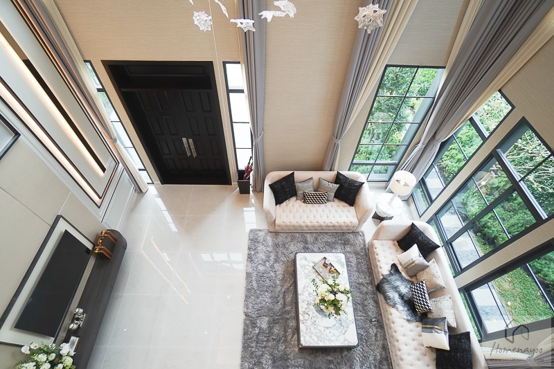 ส่วนห้องพระจะอยู่บริเวณฝั่งหน้าบ้านเพื่อฮวงจุ้ยที่ดี โดยจะเชื่อมต่อกับ Main Living Area ที่อยู่ชั้น 1 ซึ่งจริง ๆ แล้วบ้านมาตรฐานจะมีผนังทึบพร้อมหน้าต่างกั้นส่วนระหว่างพื้นที่ชั้น 1 และชั้น 2 แต่บ้านตัวอย่างตกแต่งด้วยกระจก Tempered ทำให้พื้นที่บ้านดูเชื่อมต่อกันมากขึ้น
